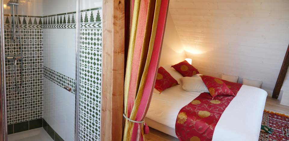 Chambre mansardée équipés de deux lits d’une personne qui peuvent s’assembler. La chambre possède sa propre douche ainsi que des WC séparés.